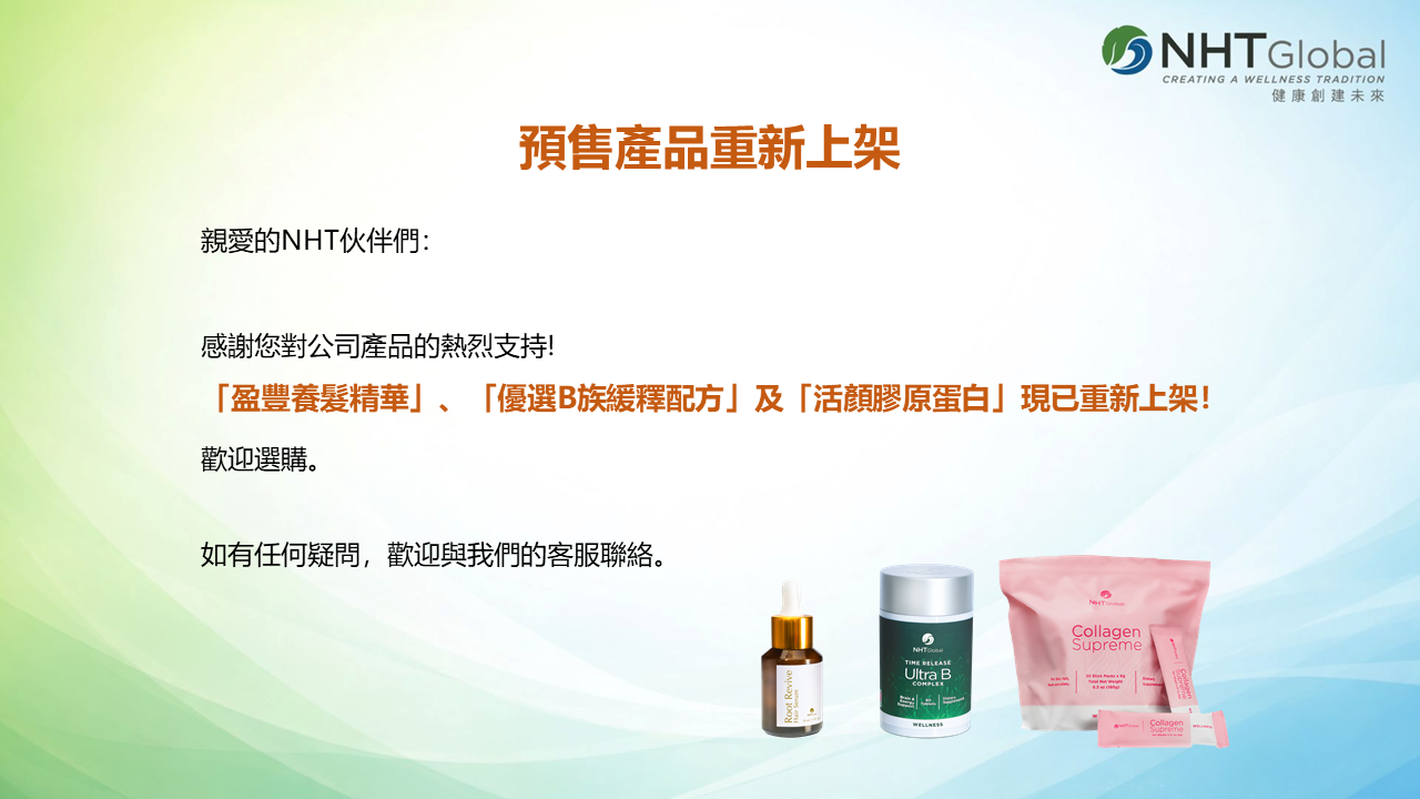 「盈豐養髮精華」、「優選B族緩釋配方」及「活顏膠原蛋白」重新上架